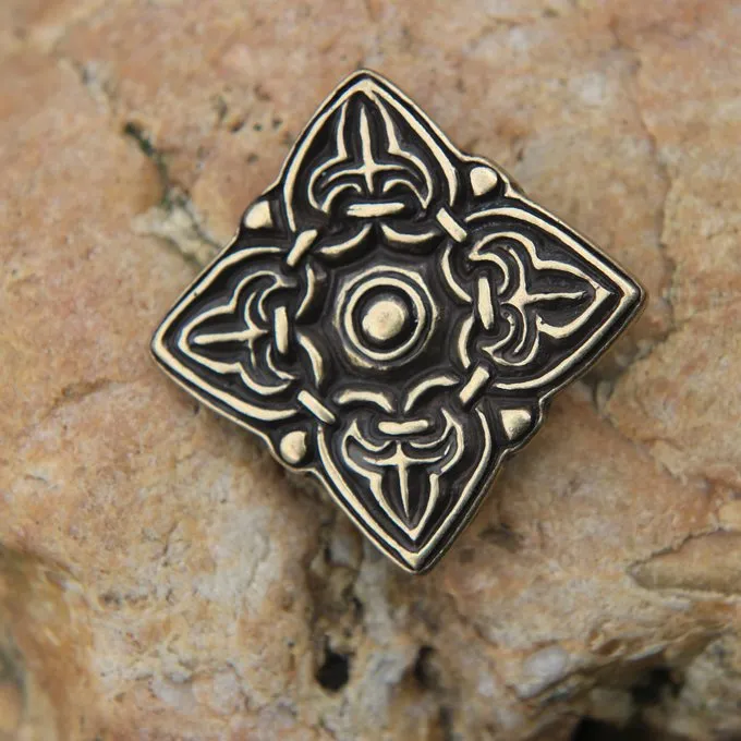 Le bouton original décorait un caftan. Le motif est typiquement Rusvik et emprunté des magyars. Les Magyars étaient un peuple nomade qui envahirent l’Europe au cours du 9ème siècle après JC et s’installèrent en Hongrie. Les Vikings de l’est négoçiaient avec eux et utilisaient sans doute leurs motifs artistiques dans leurs propres objets. Les Magyars utilisaient des boutons pour fermer leurs caftans et influençaient aussi la mode Rusvik. Les Vikings Rusvik utilisaient d’ailleurs également des boutons pour fermer leur caftans.