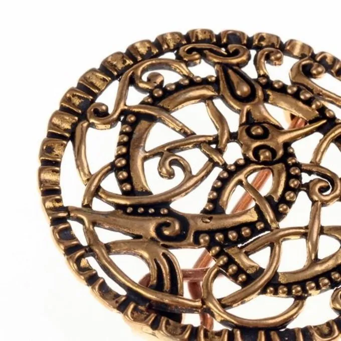 Cette broche Viking est une réplique d’un original du 10ème siècle creusée dans Pitney, en Angleterre. L’original fait maintenant partie de la collection du British Museum à Londres. La broche est fait dans le style Urnes, mais a aussi clairement les éléments anglo-saxons. Le serpent de Midgard est représenté sur la broche.
