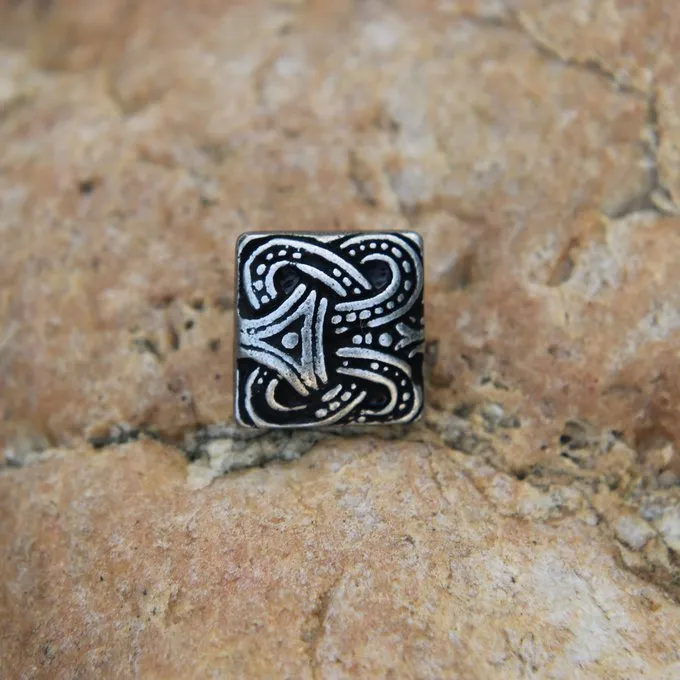 Ce raccord de ceinture Viking est fabriqué dans le style de l’art de Borre (825-970) et est basé sur un raccord original excavé dans la ville commerciale de Viking Birka. Le raccord montre un nœud en miroir et une forme triangulaire. Il peut également être utilisé pour décorer des sacs en cuir ou même des chaussures. Il mesure 1,7 x 1,6 cm et est de couleur argent ou de couleur laiton.