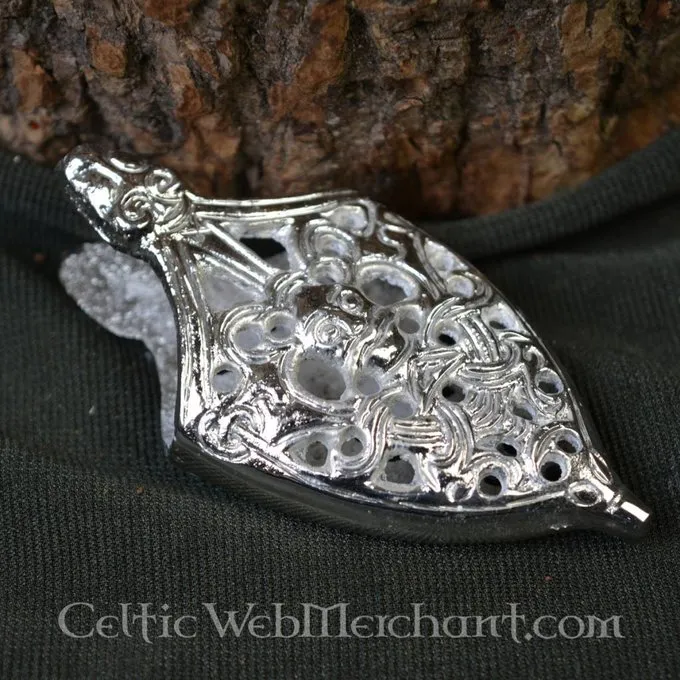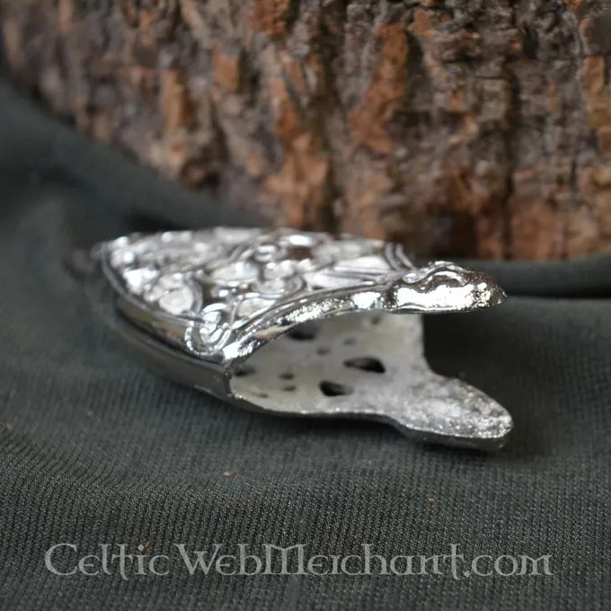 Cette chape de fourreau est basé sur les originaux du 10e-11e siècle. La chape est faite dans le style Ringerike. Il peut facilement être fixé sur le fourreau. La chape est en laiton argenté.