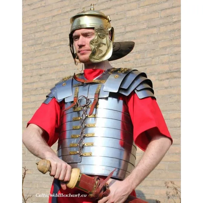 La lorica segmentata a été usée depuis le 1er siècle après JC par les légionnaires romains. Ce type d’armure était composé de bandes de fer attachées à l’intérieur sur une sangle en cuir. Cette reconstruction est basée sur l’un des trois types de segmentation de loricae qui ont été trouvés à Corbridge, dans le nord de l’Angleterre. Des modèles comme ceux-ci ont probablement été utilisés entre 40 et 140 après J.-C.
