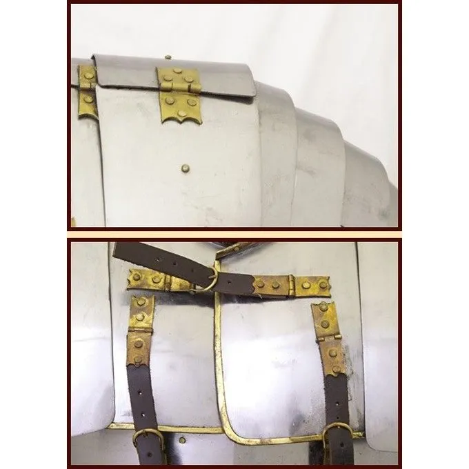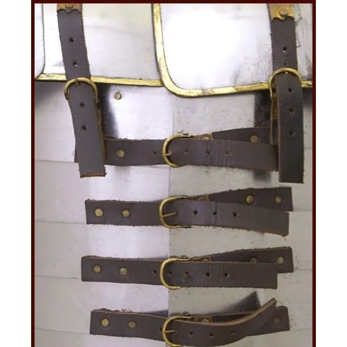 Ce segmentata lorica est faite de 1,3 mm en acier épais et orné de laiton. Il peut être fermé avec des lanières de cuir sur la poitrine. Le segmentata lorica peut être ajusté à la bonne taille et est adapté pour un tour de poitrine de 120 cm. Il pèse environ. 7 kg.