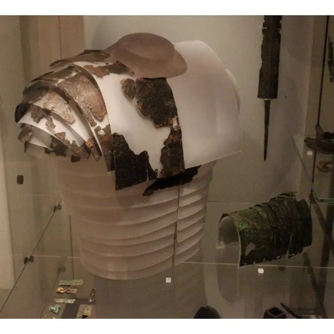 Le segmentata lorica a été porté de la 1stcentury AD par des légionnaires romains. Ce type de plaque de blindage est composée de bandes de fer qui étaient attachés à la face interne sur un bracelet en cuir. Ce est une reconstruction d’un segmentata lorica de la fin AD 1stcentury qui se trouvait dans Newstead, en Écosse. La principale différence entre ce type et est prédécesseurs est que le lorica Newstead se composait de moins? mais en plus gros – plaques.