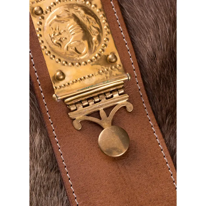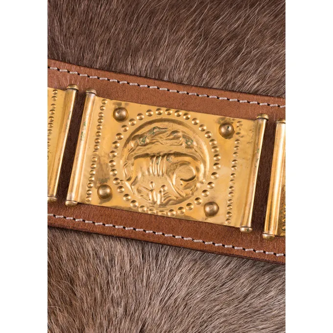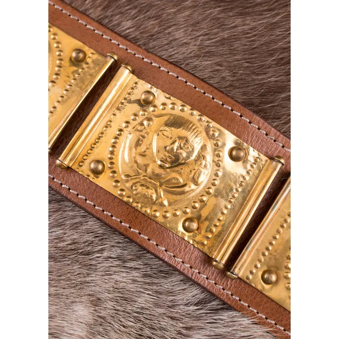 Le cingulum est une ceinture romaine porté par des légionnaires dans l’armée romaine. La ceinture a tenu le pantalon ou braies, mais avec ses belles décorations, il était aussi un symbole de réussite militaire et un rang élevé. Le tablier, composé de 4 bandes de cuir, a ptéryge en laiton et se termine par un pensilia. Les plaques carrées sur la bande présentent alternativement une face humaine et le loup alimentant les jumeaux romus et Remus. Dans la mythologie romaine, ce sont les fondateurs de la ville de Rome, une décoration adaptée pour quelqu’un de haut rang qui voulait suivre les traces de ces héros. Cette ceinture a également une boucle et une suspension pugio.
