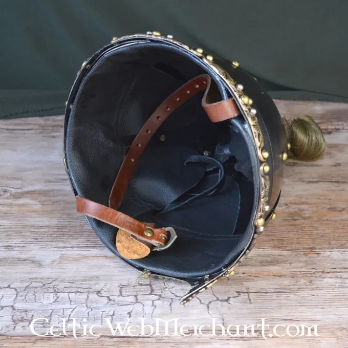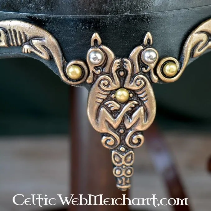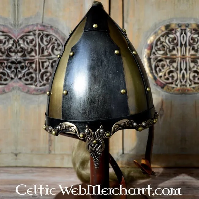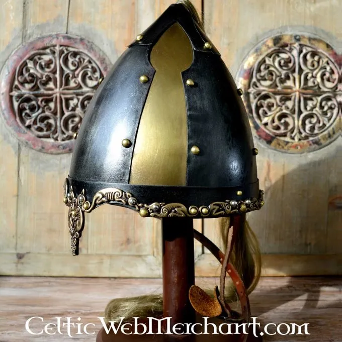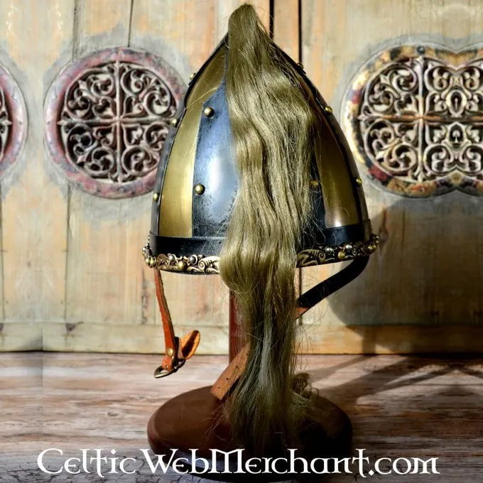 Ce casque Viking est basé sur les originaux qui ont été portés par le Rusvik, les Vikings de la Russie et de la mer Baltique. Le bord de ce spangenhelmet est décoré avec des motifs en laiton. Cette Spangenhelmet a une queue de cheval en véritable crin de cheval.