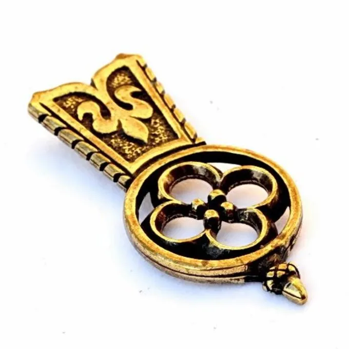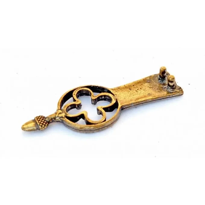 Cet embout de ceinture gothique est une réplique d’un original médiéval qui fut porté autour du 14ème siècle. L’embout de ceinture a une forme de Quatre-feuilles. Ce motif était souvent utilisé dans l’architecture et dand la bijouterie pendant la période gothique.