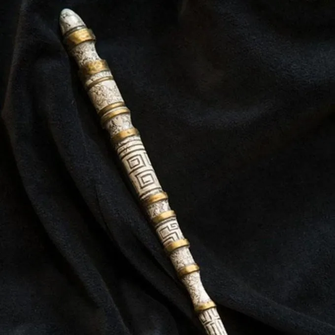 Cette baguette est conçu et réaliste peint à la main de sorte qu’il semble être en ivoire avec des bandes d’or. Cette baguette magique montre des symboles gravés dans un mystérieux manuscrit ancien. Une baguette magique pour les vrais mystiques! Cette arme de GN est constitué d’un noyau en acier flexible revêtu de mousse de polyuréthane. La baguette est entièrement flexible et adaptable à votre personnage. Cette baguette est très peu d’entretien et est parfait pour la LARP ou cosplay Harry Potter et d’autres mondes magiques