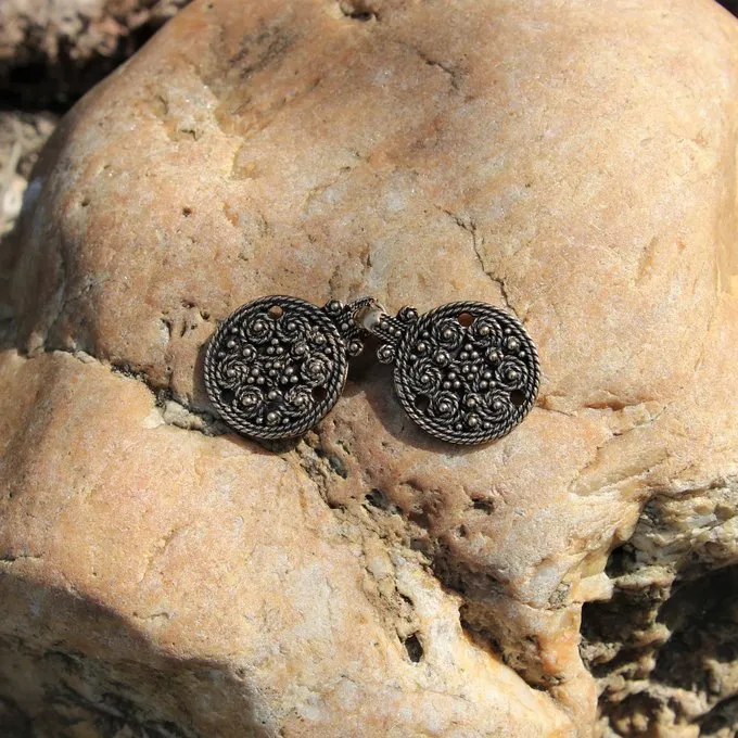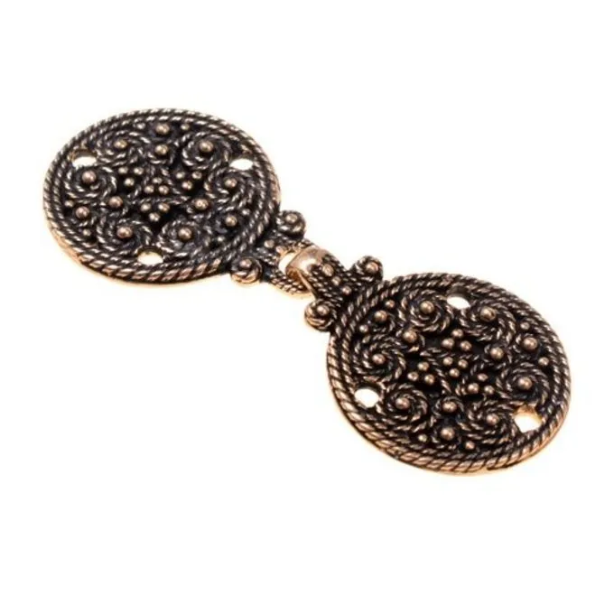 Ce fermoir du manteau est basé sur une broche tortue creusée dans la ville viking de Birka. Le péroné est granulé. Ce fermoir du manteau est semi-granulé, pour le faire paraître vraiment granulé, mais sa production était moins cher. Le fermoir du manteau peut être fixé à un manteau ou caftan.