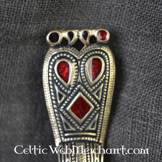 Ce péroné de l’avant-garde médiéval est une réplique d’un original du 6ème siècle trouvé dans le Kent, en Angleterre. Des phylles d’étrage émaillées similaires ont été portées par toutes les tribus germaniques, comme les Mérovingiens, les Francs, les Langobards et les Friesiens. L’original de cette fibule a probablement été créé dans l’Allemagne du Sud et est arrivé dans le sud de l’Angleterre par le commerce. L’original fait actuellement partie de la collection du British Museum à Londres.
