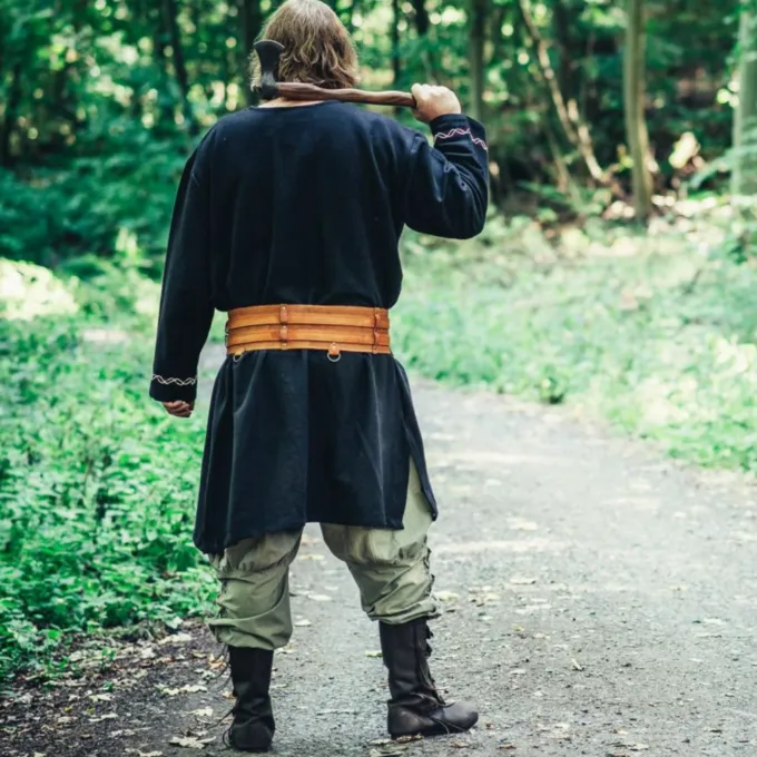 Cette ceinture se compose de deux courroies d’env. 2,5 cm de largeur qui sont fixés à une pièce de 11,5 cm de large de cuir. La surface est décorée avec un beau motif de noeud celtique. La ceinture a plusieurs anneaux pour accrocher des articles comme des sachets, couverts, couteaux, etc. Un accessoire pour compléter votre reconstitution ou costume de LARP. Cette ceinture convient aussi bien pour les hommes et les femmes, il est disponible en différentes longueurs.