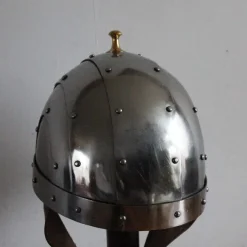 Le casque est fait d’acier d’épaisseur 2 mm et est fourni avec des rabats de la joue qui peuvent encore être vus sur les casques jusqu’à la 9ème siècle. La pièce de nez est en acier d’épaisseur 3 mm pour plus de sécurité. Le casque est muni d’une protection du cou en cotte de mailles et une garniture en cuir.
